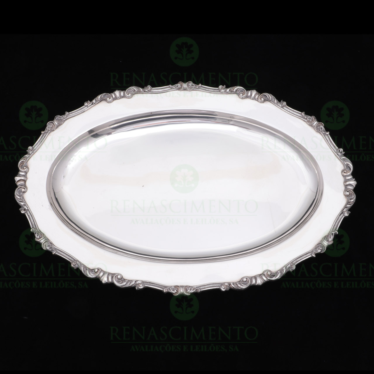 em prata de 916/000, contraste de Lisboa (1938-1984), marca comercial Joalharia do Carmo - Lisboa, aba cinzelada e relevada. Dim.: 45x30 cm. Peso: 1.395,7 g.