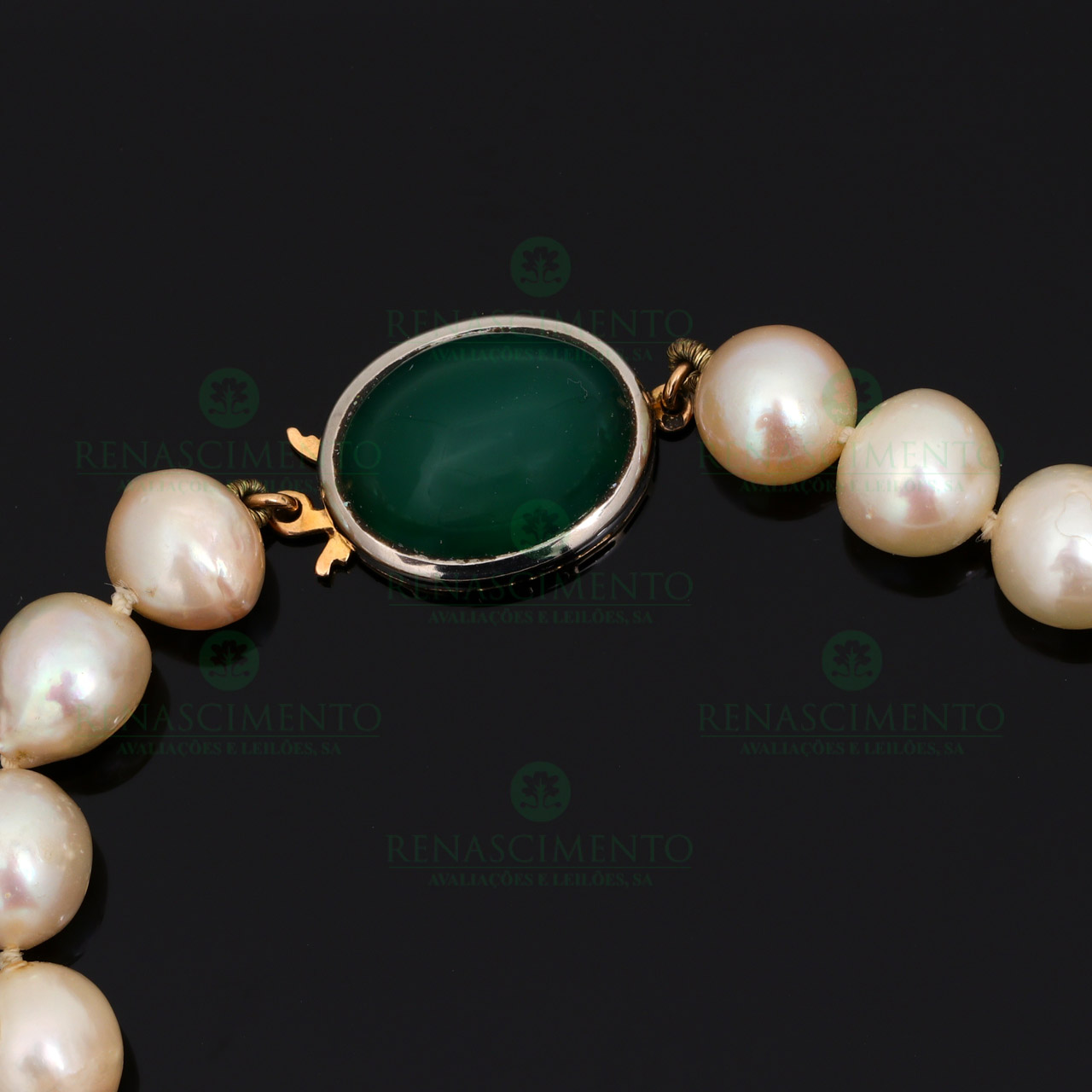 de pérolas de cultura (não testadas), fecho em ouro bicolor de 800 milésimos, cravejado com crisoprásio em talhe cabochon, contraste de Lisboa (1938-1984).