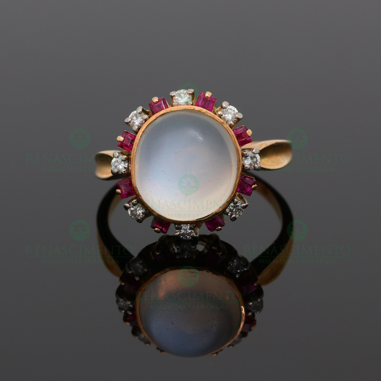 em ouro, cravejado com pedra-lua, rubis sintéticos e 8 diamantes em talhe de brilhante com o peso aproximado de 0,20 ct., Séc. XX (meados), sem marcas, abrigo do decreto-lei nº 120/2017 de 15 de Setembro de 2017. Peso: 7,7 g.