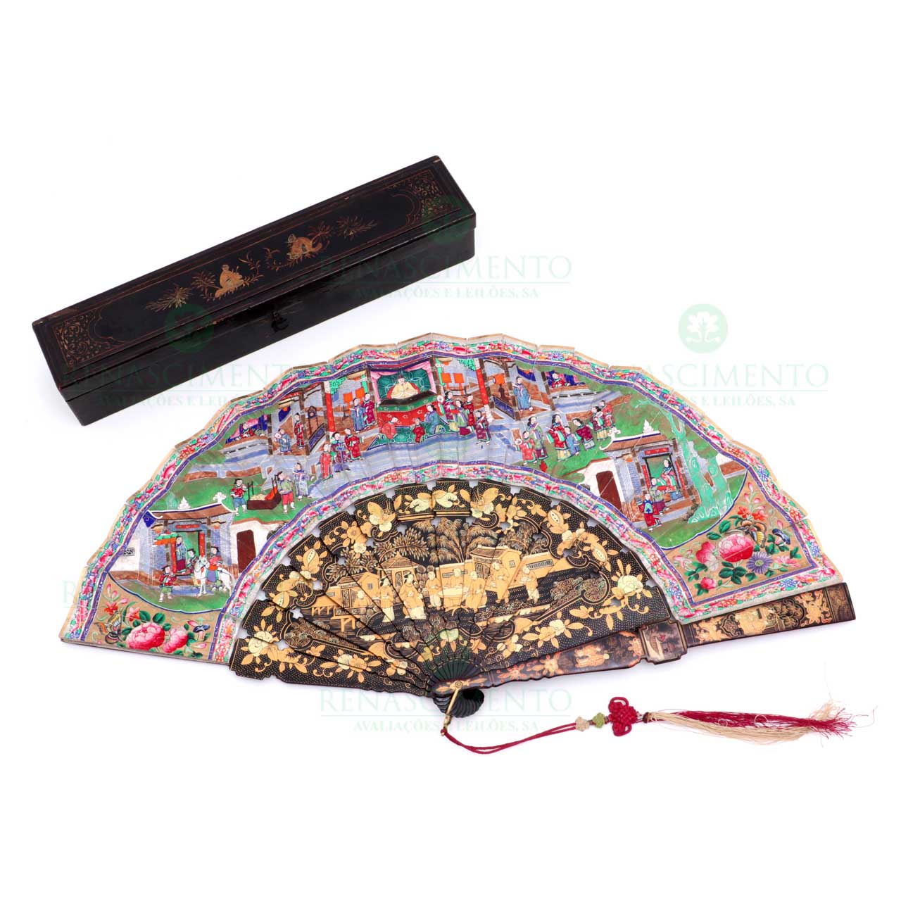 com varetas em xarão ricamente decorado a preto, ouro e coral, folha pintada a guache representando cena de Corte de um lado e do outro três reservas com cenas de Corte, flores e borboletas, sobre fundo bordeaux e prata. Caixa própria, em madeira lacada apreto e ouro. China, Séc. XIX. Sinais de uso.