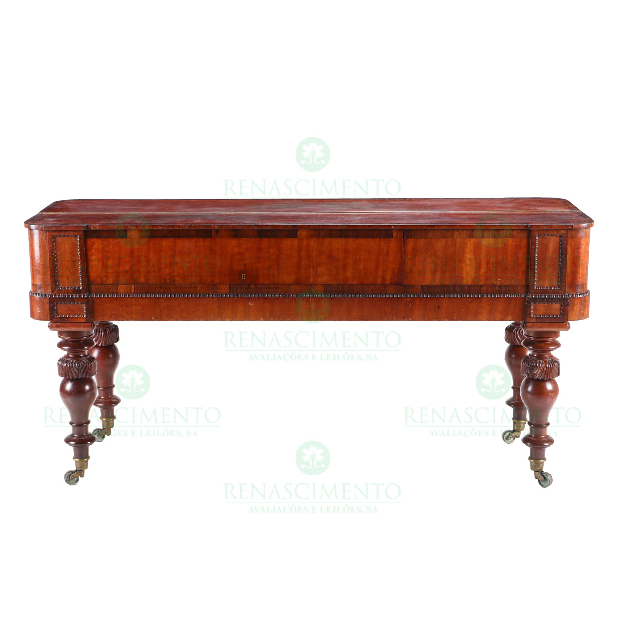 adaptado a sideboard, em mogno de Cuba, com faixa em pau-santo. Tampa de levantar com uma gaveta e 16 compartimentos com tampa. Pernas com entalhes e pés de rodízios. Inglaterra, Séc. XIX. Faltas e defeitos. Dim.: 88,5x180,5x58,5 cm.