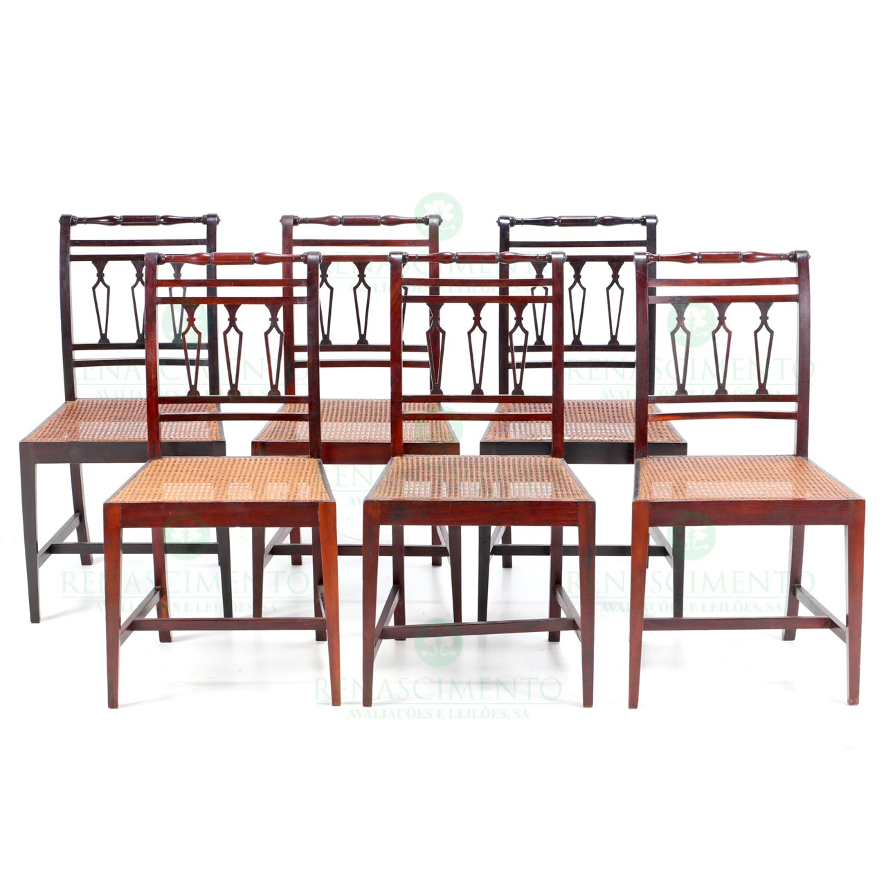 em pau-santo, tabela com entalhes e pernas com caneluras. Fundos em palhinha.