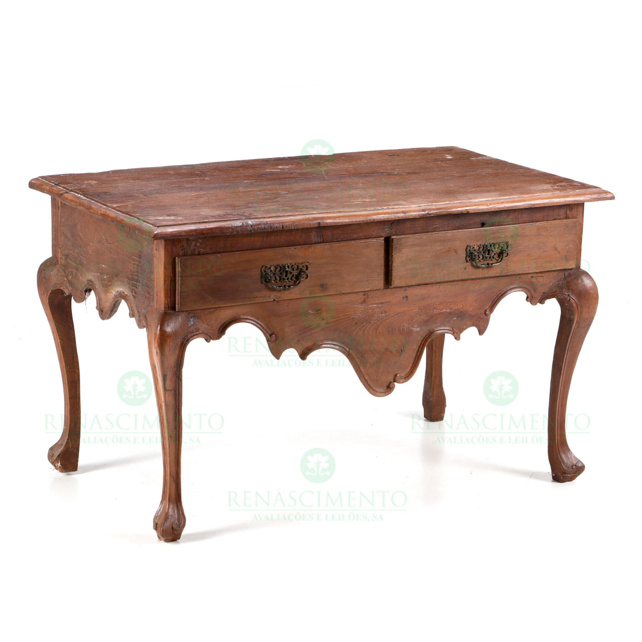em nogueira, com saial recortado. Duas gavetas. Portugal, Séc. XVIII. Faltas, defeitos e vestígios de xilófagos. Dim.: 64,5x115x66,5 cm.