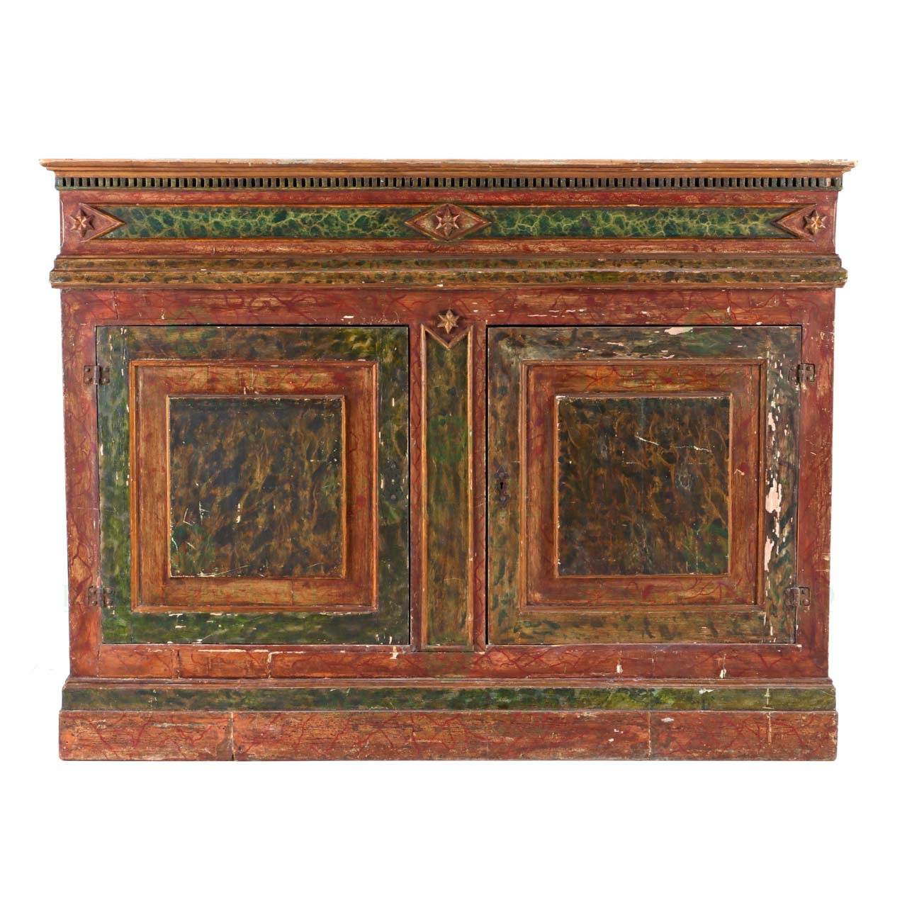 em madeira pintada e marmoreada em tons verdes e rosas, com ornatos dourados. Portugal, Séc. XVII/XVIII. Faltas, defeitos e adaptações. Dim.: 131x174,5x43 cm. Nota: em nossa opinião, trata-se do corpo superior de um armário almofadado do Séc. XVII/XVIII