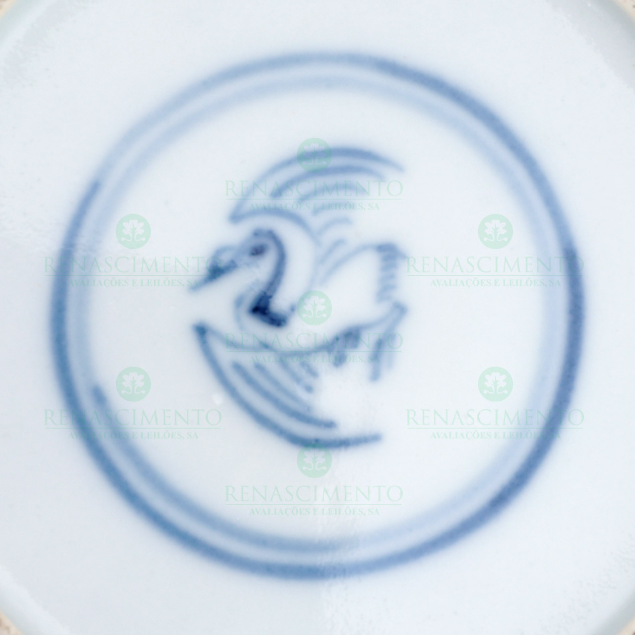 em porcelana chinesa de exportação, Dinastia Qing, Reinado Kangxi (1662-1722), com rara decoração a azul e branco representando "Cuco fora do ninho". Marcadas. Dim. taças: 7,5x8,2 cm. Diam. pires: 12,5 cm. Pires do mesmo serviço reproduzido inFrançois e Nicole Hervouët, "La Porcelaine des Compagnies des Indes à Deccor Occidental", p. 239, fig. 10.7