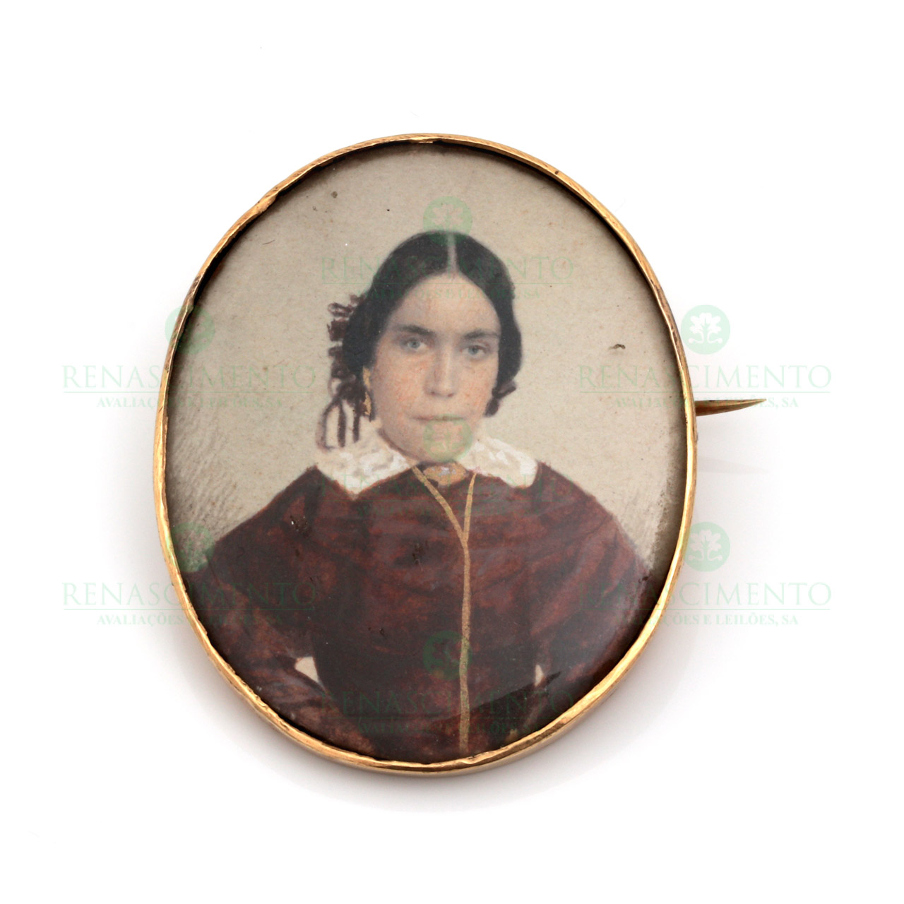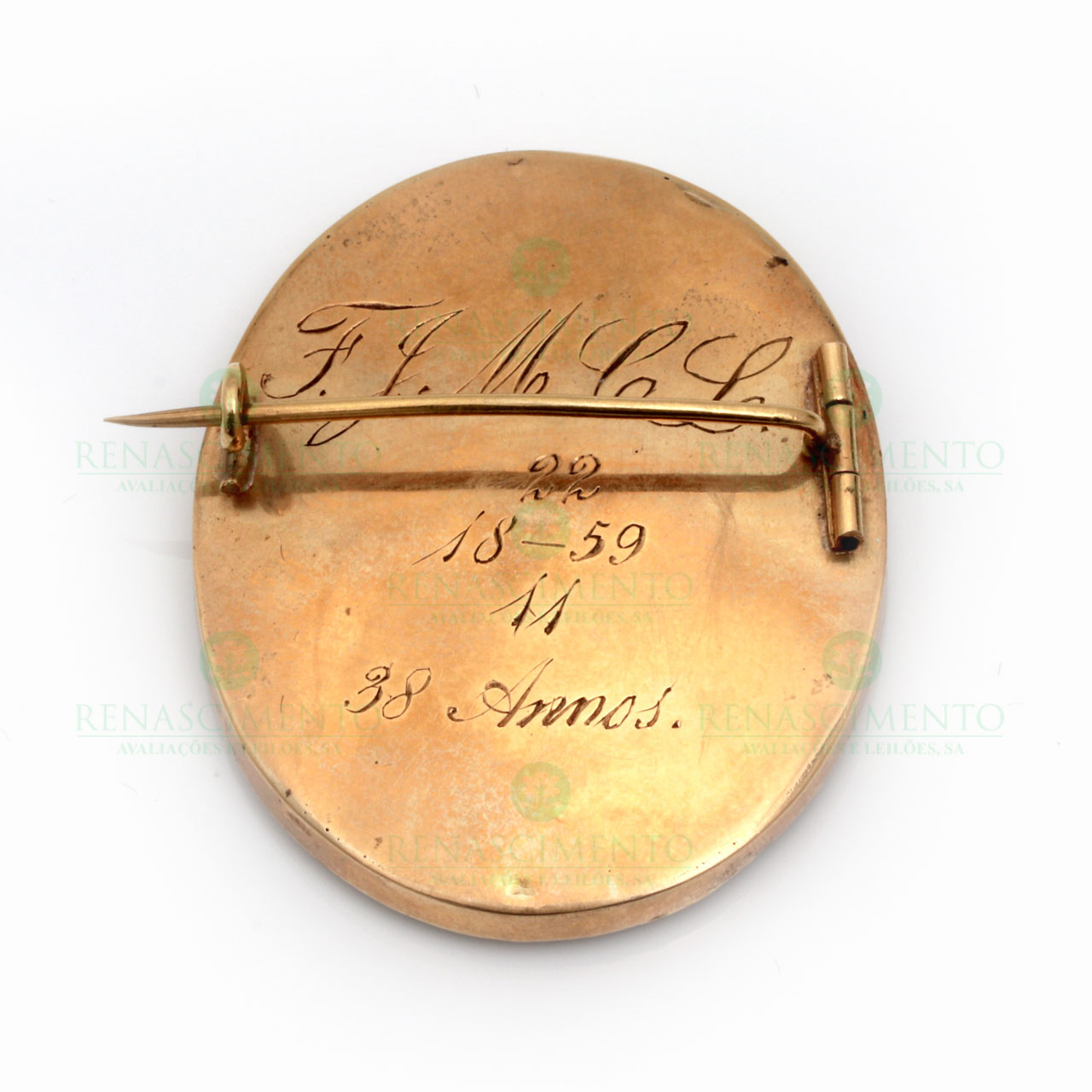 em ouro, sem contraste, ao abrigo do Decreto-Lei n.º 120/2017, de 15 de Setembro - art. 2º, nº 2, alínea c). Com miniatura feminina. Reverso com iniciais e data gravadas de 22-11-1859. Dim.: 4,3x3,1 cm. Peso bruto: 15,2 g.