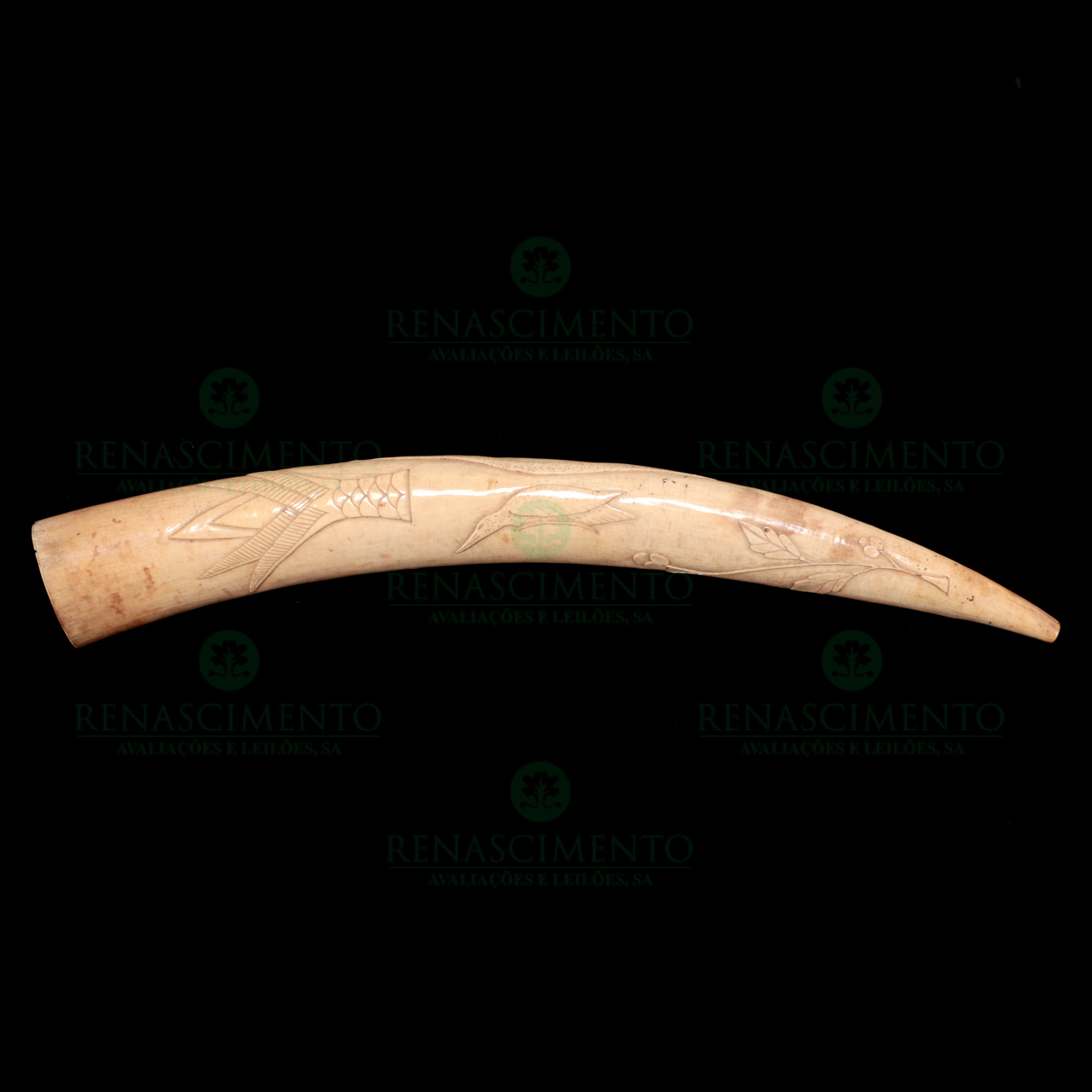em marfim esculpido representando peixes, serpente e pássaros. Congo, Séc. XIX. Pequenas faltas e defeitos. Comp.: 70 cm. Peso: 1.820,2 g.