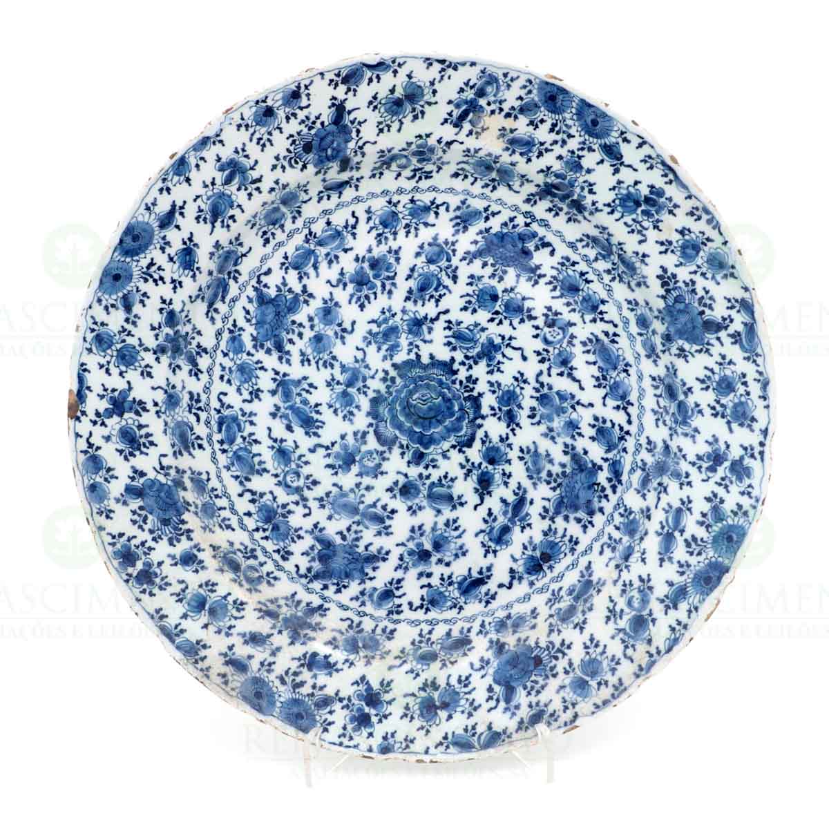 em faiança de Delft, Séc. XVIII, decorado a azul e branco com motivos florais. Marcado. Pequenas esbeiçadelas. Diam.: 34,5 cm.