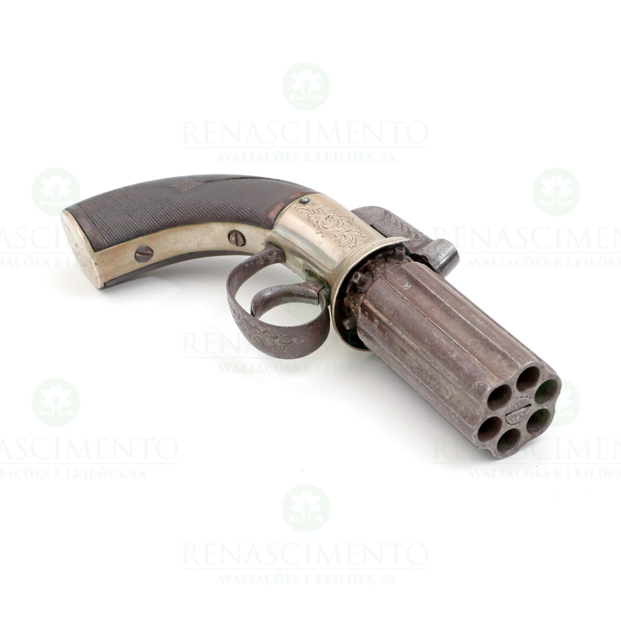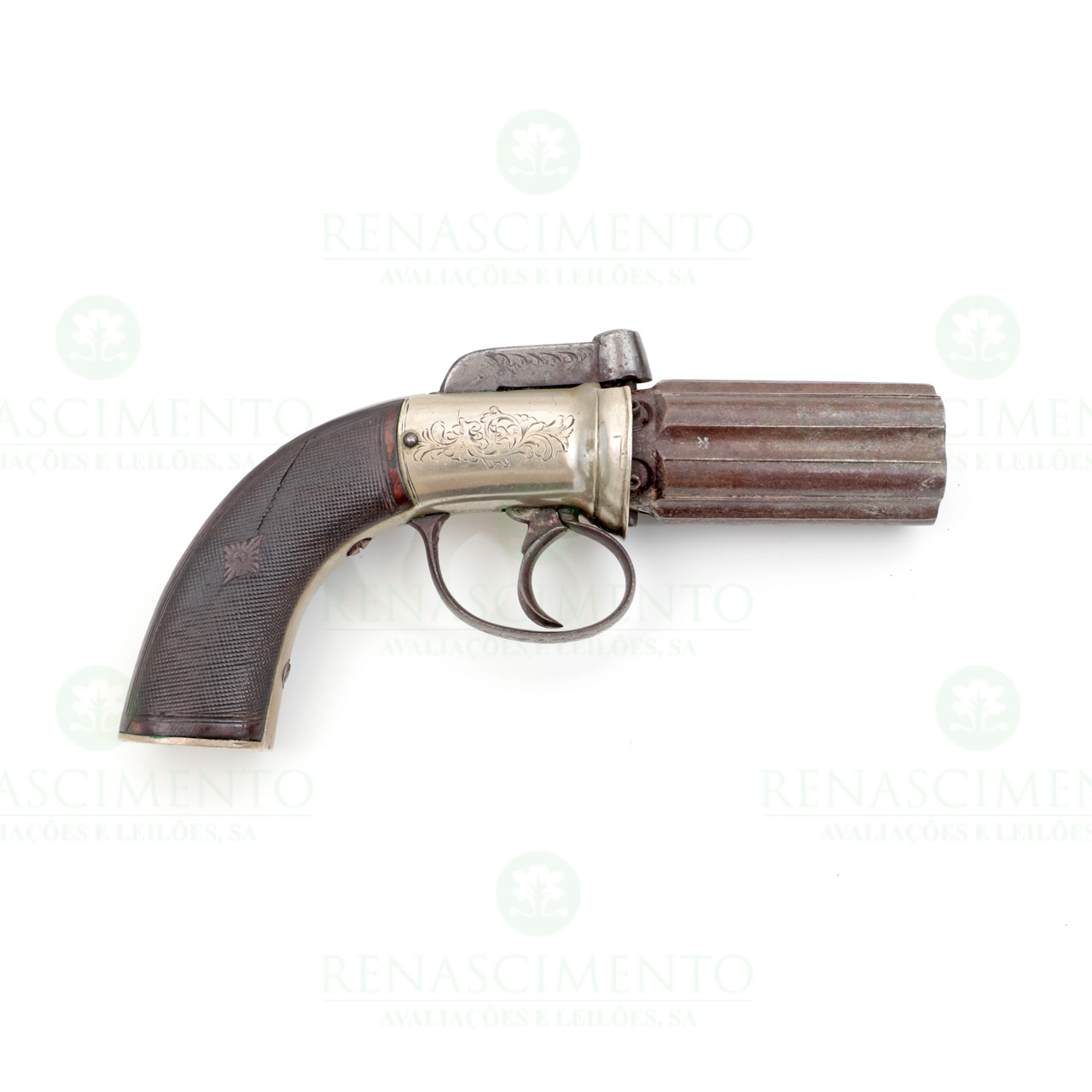 Com um bloco de seis canos de carregamento pela boca, de percussão, com punções de prova e vistoria de Birmingham. Carcaça em metal branco com gravados vegetalistas. Guarda-mato em ferro. Platinas da coronha com fina recartilha incisa. Oxidações edefeito. Comp. total aprox.: 18 cm. Cal: 8 mm.